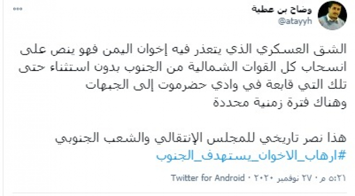 وكتب "بن عطية" تغريدة عبر تويتر، رصدها "المشهد العربي" قال فيها: "الشق العسكري الذي يتعذر فيه إخوان اليمن فهو ينص على انسحاب كل القوات الشمالية من الجنوب بدون استثناء حتى تلك التي قابعة في وادي حضرموت إلى الجبهات، وهناك فترة زمنية محددة".