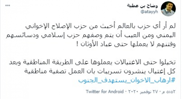 وكتب "بن عطية" تغريدة عبر تويتر، رصدها "المشهد العربي" قال فيها: "لم أر أي حزب بالعالم أخبث من حزب الإصلاح الإخواني اليمني ومن العيب أن يتم وصفهم حزب إسلامي ودسائسهم وفتنهم لا يعملها حتى عباد الأوثان"!