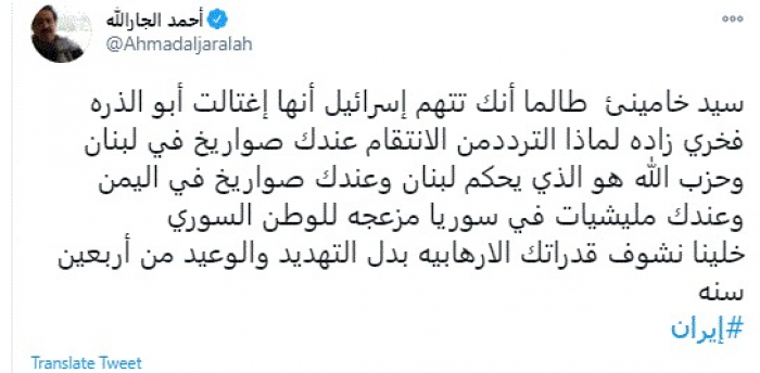 وقال في تغريدة عبر "تويتر" رصدها "المشهد العربي": "سيد خامنئي طالما أنك تتهم إسرائيل أنها اغتالت أبو الذرة فخري زاده لماذا التردد من الانتقام عندك صواريخ في لبنان وحزب الله هو الذي يحكم لبنان وعندك صواريخ في اليمن وعندك مليشيات في سوريا مزعجة للوطن السوري".