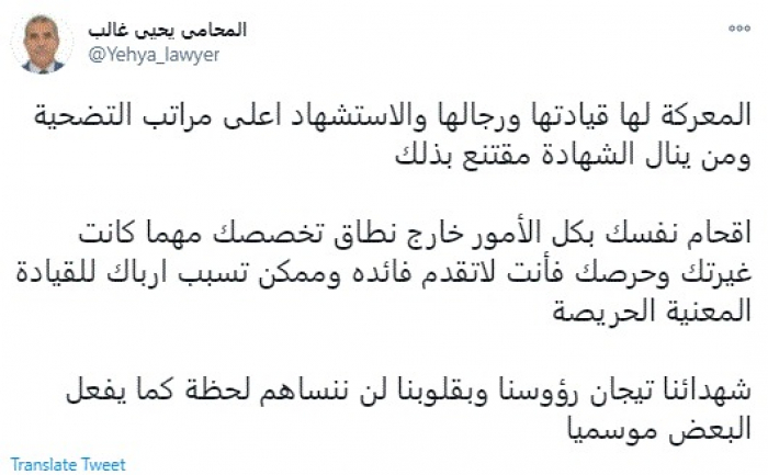 وقال في تغريدة عبر "تويتر" رصدها "المشهد العربي": "المعركة لها قيادتها ورجالها والاستشهاد أعلى مراتب التضحية ومن ينال الشهادة مقتنع بذلك".