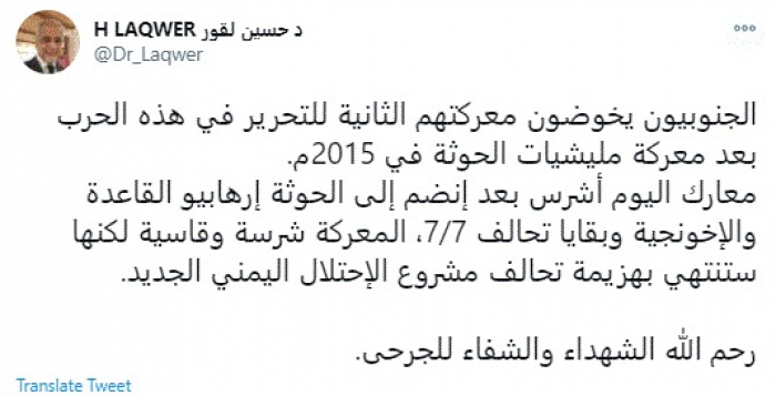 وكتب في تغريدة عبر "تويتر" رصدها "المشهد العربي": "الجنوبيون يخوضون معركتهم الثانية للتحرير في هذه الحرب بعد معركة مليشيات الحوثة في 2015م".
