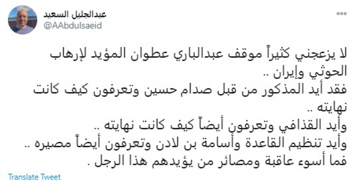 وقال في تغريدة عبر "تويتر" رصدها "المشهد العربي": "لا يزعجني كثيرًا موقف عبدالباري عطوان المؤيد لإرهاب الحوثي وإيران.. فقد أيد المذكور من قبل صدام حسين وتعرفون كيف كانت نهايته".