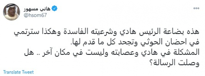 وقال في تغريدة عبر "تويتر" رصدها "المشهد العربي": "هذه بضاعة الرئيس هادي وشرعيته الفاسدة وهكذا سترتمي في أحضان الحوثي وتجحد كل ما قدم لها. المشكلة في هادي وعصابته وليست في مكان آخر.. هل وصلت الرسالة؟".