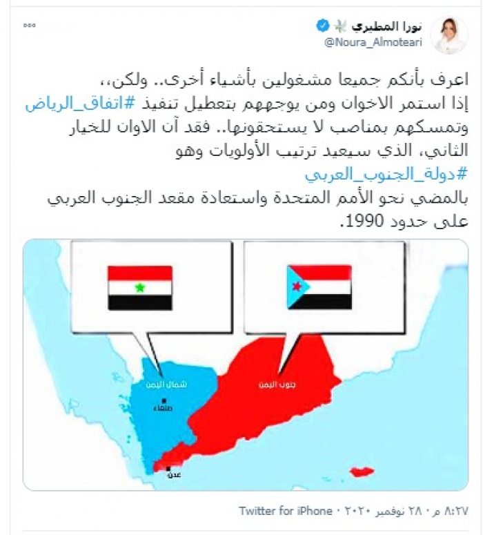 وكتبت "المطيري" تغريدة عبر تويتر، رصدها "المشهد العربي"، قالت فيها: "أعرف أنكم جميعًا مشغولون بأشياء أخرى ولكن، إذا استمر الإخوان ومن يوجههم بتعطيل تنفيذ اتفاق الرياض، وتمسكهم بمناصب لا يستحقونها، فقد آن الأوان للخيار الثاني، الذي سيعيد ترتيب الأولويات وهو دولة الجنوب العربي، بالمضي نحو الأمم المتحدة واستعادة مقعد الجنوب العربي، على حدود 1990".