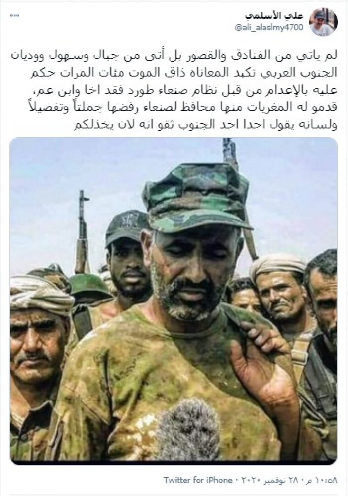 وكتب "الأسلمي" تغريدة عبر تويتر، رصدها "المشهد العربي": "لم يأتِ من الفنادق والقصور بل أتى من جبال وسهول ووديان الجنوب العربي، تكبد المعاناة ذاق الموت مئات المرات حكم عليه بالإعدام من قبل نظام صنعاء، طورد، فقد أخًا وابن عم، قدمو له المغريات منها محافظ لصنعاء رفضها جملةً وتفصيلًا، ولسانه يقول أحدٌ أحد الجنوب، ثقوا أنه لن يخذلكم".
