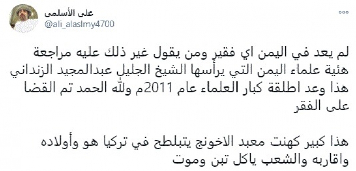 وقال في تغريدة عبر "تويتر" رصدها "المشهد العربي": "لم يعد في اليمن أي فقير ومن يقول غير ذلك عليه مراجعة هيئة علماء اليمن التي يرأسها عبدالمجيد الزنداني هذا وعد اطلقه كبار العلماء عام 2011م ولله الحمد تم القضاء على الفقر".