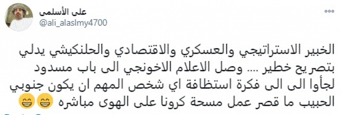 وقال في تغريدة عبر "تويتر" رصدها "المشهد العربي": "الخبير الاستراتيجي والعسكري والاقتصادي و.... يدلي بتصريح خطير .... وصل الإعلام الإخونجي إلى باب مسدود لجأوا إلى فكرة استضافة أي شخص المهم أن يكون جنوبي الحبيب ما قصر عمل مسحة كورونا على الهواء مباشرة".
