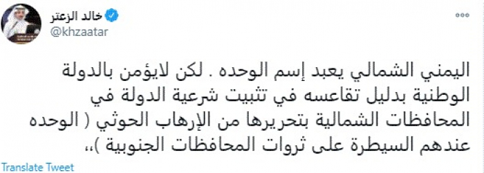 وكتب في تغريدة عبر "تويتر" رصدها "المشهد العربي": "اليمني الشمالي يعبد اسم الوحدة. لكن لا يؤمن بالدولة الوطنية بدليل تقاعسه في تثبيت شرعية الدولة في المحافظات الشمالية بتحريرها من الإرهاب الحوثي ( الوحدة عندهم السيطرة على ثروات المحافظات الجنوبية)".