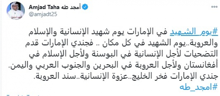 وكتب في تغريدة عبر "تويتر" رصدها "المشهد العربي": "يوم الشهيد في الإمارات يوم شهيد الإنسانية والإسلام والعروبة..يوم الشهيد في كل مكان .. فجندي الإمارات قدم التضحيات لأجل الإنسانية في البوسنة ولأجل الإسلام في أفغانستان ولأجل العروبة في البحرين والجنوب العربي واليمن".