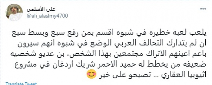 وأضاف: "بن عديو شخصية ضعيفة من يخطط له حميد الأحمر شريك أردوغان في مشروع إثيوبيا العقاري".