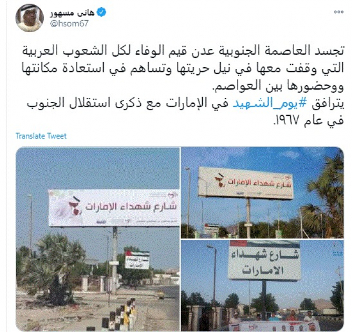 وأضاف: "يترافق يوم الشهيد في الإمارات مع ذكرى استقلال الجنوب في عام 1967".