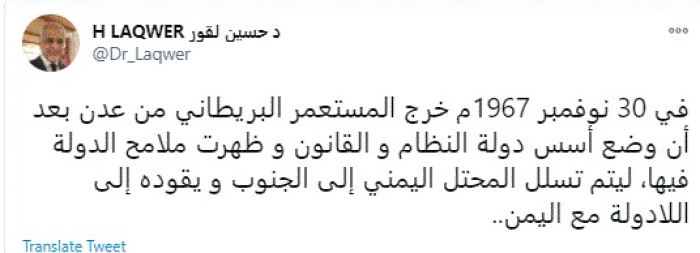 وكتب في تغريدة عبر "تويتر" رصدها "المشهد العربي": "في 30 نوفمبر 1967م خرج المستعمر البريطاني من عدن بعد أن وضع أسس دولة النظام والقانون وظهرت ملامح الدولة فيها، ليتم تسلل المحتل اليمني إلى الجنوب ويقوده إلى اللادولة مع اليمن".