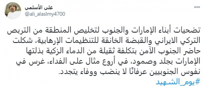 الأسلمي عن يوم الشهيد: دماء أبناء الإمارات الزكية شكلتّ حاضر الجنوب الآمن