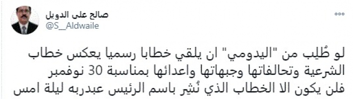 وقال في تغريدة عبر "تويتر" رصدها "المشهد العربي": "لو طُلِب من اليدومي أن يلقي خطابًا رسميًا يعكس خطاب الشرعية وتحالفاتها وجبهاتها وأعدائها بمناسبة 30 نوفمبر. فلن يكون إلا الخطاب الذي نُشِر باسم الرئيس عبدربه ليلة أمس".