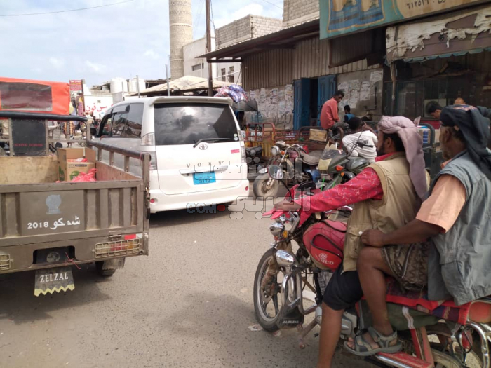 تعرقل مستودعات المحال التجارية، وسيارات نقل البضائع الحركة المرورية في الشارع الرئيسي بمدخل مدينة جعار في محافظة أبين.