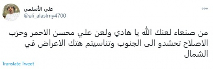 وقال في تغريدة عبر "تويتر" رصدها "المشهد العربي": "من صنعاء لعنك الله يا هادي ولعن علي محسن الاحمر وحزب الإصلاح تحشدوا إلى الجنوب وتناسيتم هتك الأعراض في الشمال".