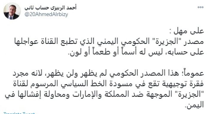 وأضاف: "عمومًا؛ هذا المصدر الحكومي لم يظهر ولن يظهر، لأنه مجرد فقرة توجيهية تقع في مسودة الخط السياسي المرسوم لقناة الجزيرة الموجهة ضد المملكة والإمارات ومحاولة إفشالها في اليمن".
