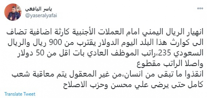 وقال في تغريدة عبر "تويتر" رصدها "المشهد العربي": "انهيار الريال اليمني أمام العملات الأجنبية كارثة إضافية تضاف إلى كوارث هذا البلد اليوم الدولار يقترب من 900 ريال والريال السعودي 235، راتب الموظف العادي بات أقل من 50 دولار وأصلا الراتب مقطوع".