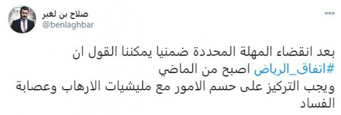 وقال "بن لغبر"، في تغريدة له، عبر "تويتر"، رصدها "المشهد العربي": "بعد انقضاء المهلة المحددة ضمنيا يمكننا القول إن اتفاق الرياض أصبح من الماضي".