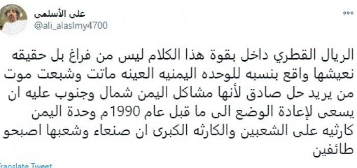 وكتب في تغريدة عبر "تويتر" رصدها "المشهد العربي": "الريال القطري داخل بقوة هذا الكلام ليس من فراغ بل حقيقة نعيشها واقع بالنسبة للوحدة اليمنية العينة ماتت وشبعت موت".