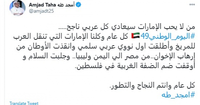وقال في تغريدة عبر "تويتر" رصدها "المشهد العربي": "من لا يحب الإمارات سيعادي كل عربي ناجح..... اليوم الوطني 49 كل عام وكلنا الإمارات التي تنقل العرب للمريخ وأطلقت أول نووي عربي سلمي وأنقذت الأوطان من إرهاب الإخوان.. من مصر إلى اليمن وليبيا.. وجلبت السلام وأوقفت ضم الضفة الغربية في فلسطين. كل عام وأنتم النجاح والتطور".