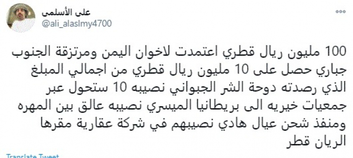 وقال في تغريدة عبر "تويتر" رصدها "المشهد العربي": "100 مليون ريال قطري اعتمدت لإخوان اليمن ومرتزقة الجنوب جباري حصل على 10 مليون ريال قطري من إجمالي المبلغ الذي رصدته دوحة الشر".