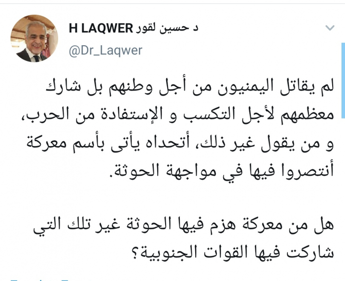 وقال في تغريدة له عبر "تويتر"، رصدها "المشهد العربي": لم يقاتل اليمنيون من أجل وطنهم بل شارك معظمهم لأجل التكسب والاستفادة من الحرب".