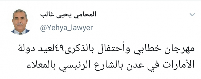 وقال في تغريدة له، عبر "تويتر"، رصدها "المشهد العربي": مهرجان خطابي واحتفال بالذكرى الـ 49 لعيد دولة الإمارات في عدن بالشارع الرئيسي بالمعلا".