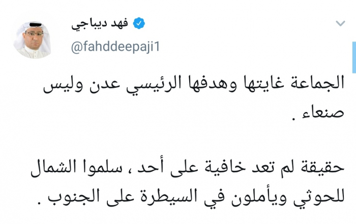 وكتب في تغريدة له عبر "تويتر"، رصدها "المشهد العربي": الجماعة غايتها وهدفها الرئيسي عدن وليس صنعاء".