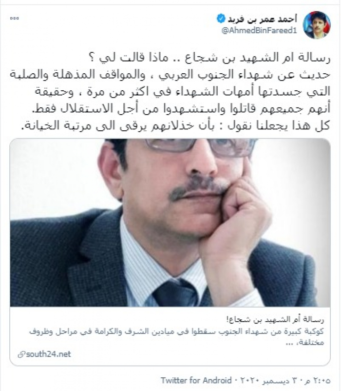أكد رئيس دائرة العلاقات الخارجية بالمجلس الانتقالي الجنوبي في أوروبا أحمد عمر بن فريد، أن خُذلان شهداء الجنوب يُعد خيانة.