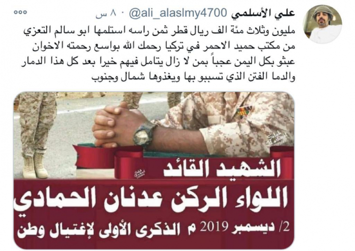 وكتب في تغريدة عبر "تويتر"، رصدها "المشهد العربي": "مليون وثلاث مئة ألف ريال قطري ثمن رأسه استلمها أبو سالم التعزي من مكتب حميد الأحمر في تركيا رحمك الله بواسع رحمته الإخوان عبثوا بكل اليمن عجبًا بمن لازال يتأمل فيهم خيرًا بعد كل هذا الدمار والدماء والفتن التي تسببوا بها ويغذونها شمال وجنوب".