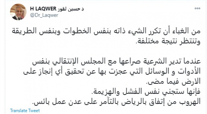 وأضاف: "عندما تدير الشرعية صراعها مع المجلس الإنتقالي بنفس الأدوات و الوسائل التي عجزت بها عن تحقيق أي إنجاز على الارض فيما مضى فإنها ستجني نفس الفشل والهزيمة".
