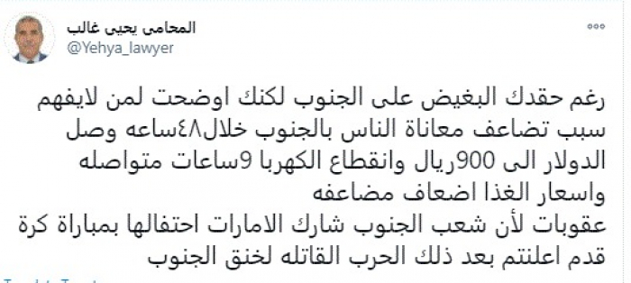 وقال في تغريدة عبر "تويتر" رصدها "المشهد العربي": "رغم حقدك البغيض على الجنوب لكنك أوضحت لمن لا يفهم سبب تضاعف معاناة الناس بالجنوب خلال 48 ساعة وصل الدولار إلى 900 ريال وانقطاع الكهرباء 9 ساعات متواصلة وأسعار الغذاء أضعاف مضاعفة عقوبات لأن شعب الجنوب شارك الإمارات احتفالها بمباراة كرة قدم أعلنتم بعد ذلك الحرب القاتلة لخنق الجنوب".