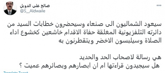 وقال في تغريدة عبر "تويتر" رصدها "المشهد العربي": "سيعود الشماليون إلى صنعاء وسيحضرون خطابات السيد من دائرته التلفزيونية المغلقة حفاة الأقدام خاشعين كخشوع أداء الصلاة وسيلبسون الأخضر ويتقطرنون به هي رسالة لأصحاب الحد والحديد هل سيجيدون قراءتها أم أن أبصارهم وبصائرهم عميت؟".