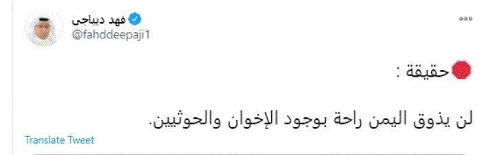 وقال في تغريدة عبر "تويتر" رصدها "المشهد العربي": "حقيقة: لن يذوق اليمن راحة بوجود الإخوان والحوثيين".