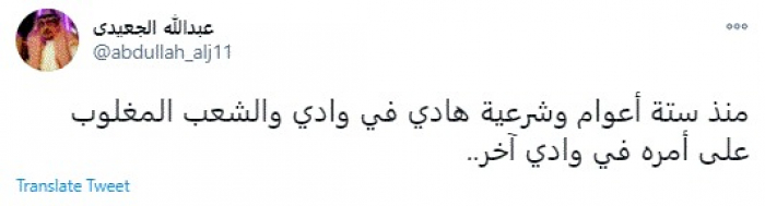 وقال في تغريدة عبر "تويتر" رصدها "المشهد العربي": "منذ ستة أعوام وشرعية هادي في وادي والشعب المغلوب على أمره في وادي آخر".