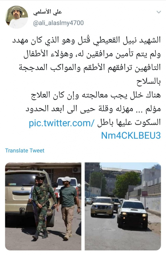 وكتب "الأسلمي"، في تغريدة عبر "تويتر"، رصدها "المشهد العربي": "الشهيد نبيل القعيطي قُتل وهو الذي كان مهددا ولم يتم تأمين مرافقين له، وهؤلاء الأطفال التافهون ترافقهم الأطقم والمواكب المدججة بالسلاح".