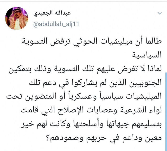 هاجم الشاعر عبد الله الجعيدي، اليوم، مليشيات الحوثي الإرهابية المدعومة من إيران، مطالبًا بضرورة تمكين الجنوبيين.