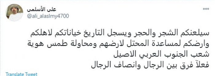 وقال في تغريدة عبر "تويتر" رصدها "المشهد العربي": "سيلعنكم الشجر والحجر ويسجل التاريخ خياناتكم لأهلكم وأرضكم، لمساعدة المحتل لأرضهم، ومحاولة طمس هوية شعب الجنوب العربي الأصيل".