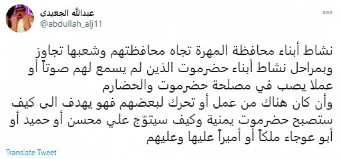 وقال في تغريدة عبر "تويتر" رصدها "المشهد العربي": "نشاط أبناء محافظة المهرة تجاه محافظتهم وشعبها تجاوز وبمراحل نشاط أبناء حضرموت الذين لم يسمع لهم صوتًا أو عملًا يصب في مصلحة حضرموت والحضارم".