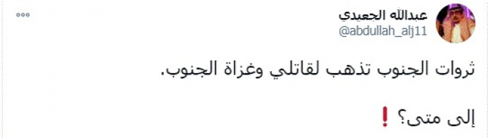 وقال في تغريدة عبر "تويتر" رصدها "المشهد العربي": "ثروات الجنوب تذهب لقاتلي وغزاة الجنوب. إلى متى؟".