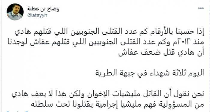 وقال في تغريدة عبر "تويتر" رصدها "المشهد العربي": "إذا حسبنا بالأرقام كم عدد القتلى الجنوبيين اللي قتلهم هادي منذ ٢٠١٢م وكم عدد القتلى الجنوبيين اللي قتلهم عفاش لوجدنا أن هادي قتل ضعف عفاش اليوم ثلاثة شهداء في جبهة الطرية".