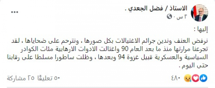 وكتب "الجعدي" تغريدة عبر تويتر، رصدها "المشهد العربي": "نرفض العنف وندين جرائم الاغتيالات بكل صورها ، ونترحم على ضحاياها".