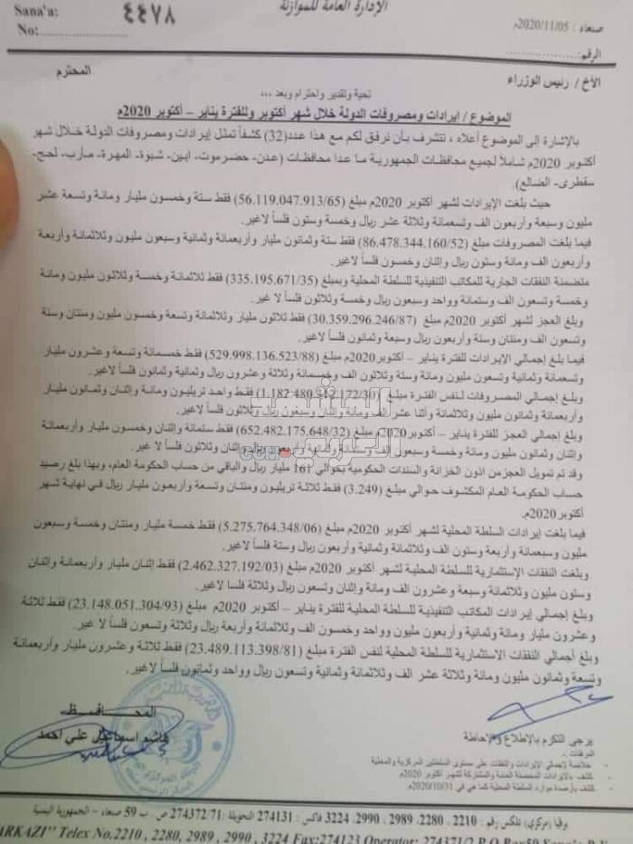 ووفق الوثيقة الموجهة من محافظ البنك المركزي بصنعاء إلى رئيس حكومة المليشيا المدعومة من إيران، فإن المبالغ المصروفة من البنك خلال الفترة من يناير إلى أكتوبر خلال العام الجاري، بلغت ترليون و182 مليار ريال، وجاء في الوثيقة أن إيرادات ذات الفترة بلغت 530 مليار ريال، مشيرًا إلى تمويل العجز من أذون الخزانة والسندات الرسمية.