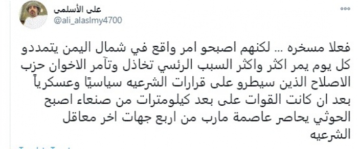 وكتب في تغريدة عبر "تويتر" رصدها "المشهد العربي": "فعلا مسخرة... لكنهم أصبحوا أمر واقع في شمال اليمن يتمددوا كل يوم يمر أكثر وأكثر السبب الرئيسي تخاذل وتآمر الإخوان حزب الإصلاح الذين سيطروا على قرارات الشرعية سياسيًا وعسكريًا بعد أن كانت القوات على بعد كيلومترات من صنعاء أصبح الحوثي يحاصر عاصمة مأرب من أربع جهات آخر معاقل الشرعية".
