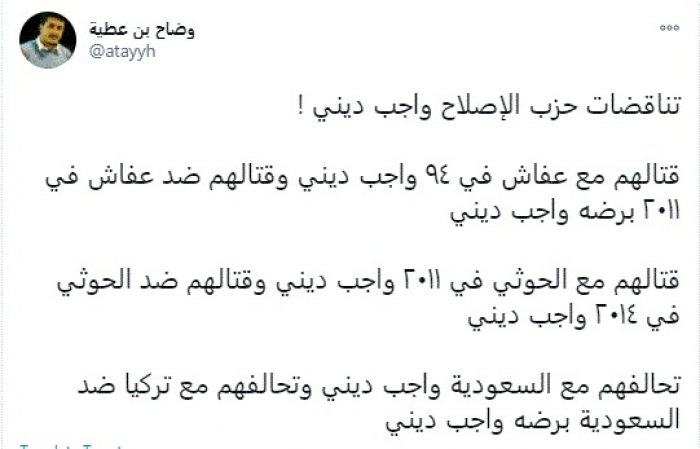 استنكر الكاتب الصحفي وضاح بن عطية، اليوم، تناقضات سياسات وأفعال حزب الإصلاح اليمني، ومتاجرة قياداته بالدين.