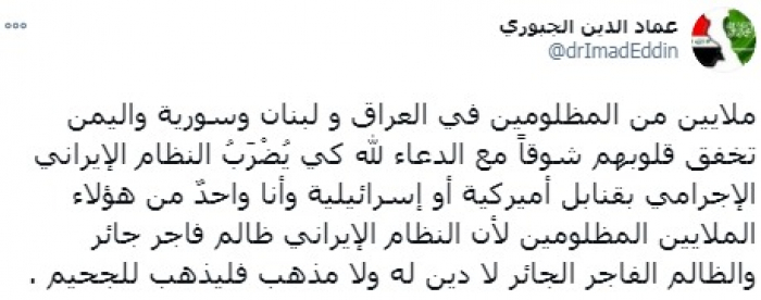 وقال في تغريدة على حسابه بموقع التدوين المصغر (تويتر)، اليوم، إن "ملايين من المظلومين في العراق و لبنان وسورية واليمن تخفق قلوبهم شوقًا مع الدعاء لله كي يُضْرَبُ النظام الإيراني الإجرامي بقنابل أميركية أو إسرائيلية".