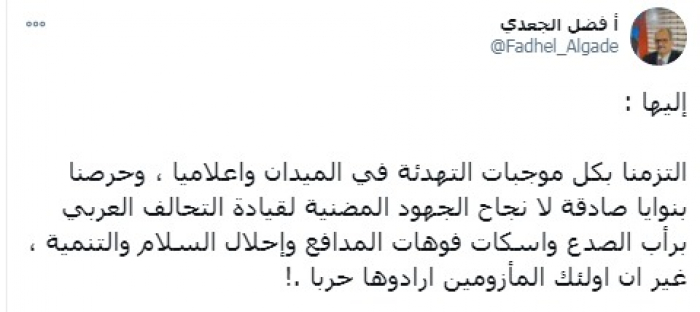 وقال في تغريدة على حسابه بموقع التدوين المصغر (تويتر)، اليوم، إننا: "التزمنا بكل موجبات التهدئة في الميدان وإعلاميا، وحرصنا بنوايا صادقة على إنجاح الجهود المضنية لقيادة التحالف العربي برأب الصدع وإسكات فوهات المدافع وإحلال السلام والتنمية، غير أن أولئك المأزومين أرادوها حربا".