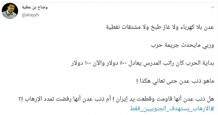 وعبر عن تردي الأوضاع بعدن في تغريدة على حسابه بموقع التدوين المصغر (تويتر)، اليوم، بقوله "عدن بلا كهرباء ولا غاز طبخ ولا مشتقات نفطية، وربي ما يحدث جريمة حرب، بداية الحرب كان راتب المدرس يعادل 500 دولار والآن 100 دولار"