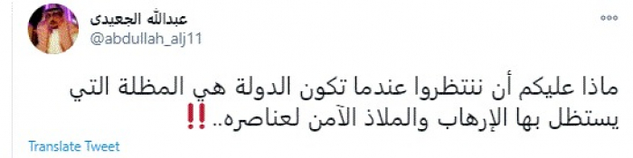 وقال في تغريدة عبر "تويتر" رصدها "المشهد العربي": "ماذا عليكم أن ننتظروا عندما تكون الدولة هي المظلة التي يستظل بها الإرهاب والملاذ الآمن لعناصره".